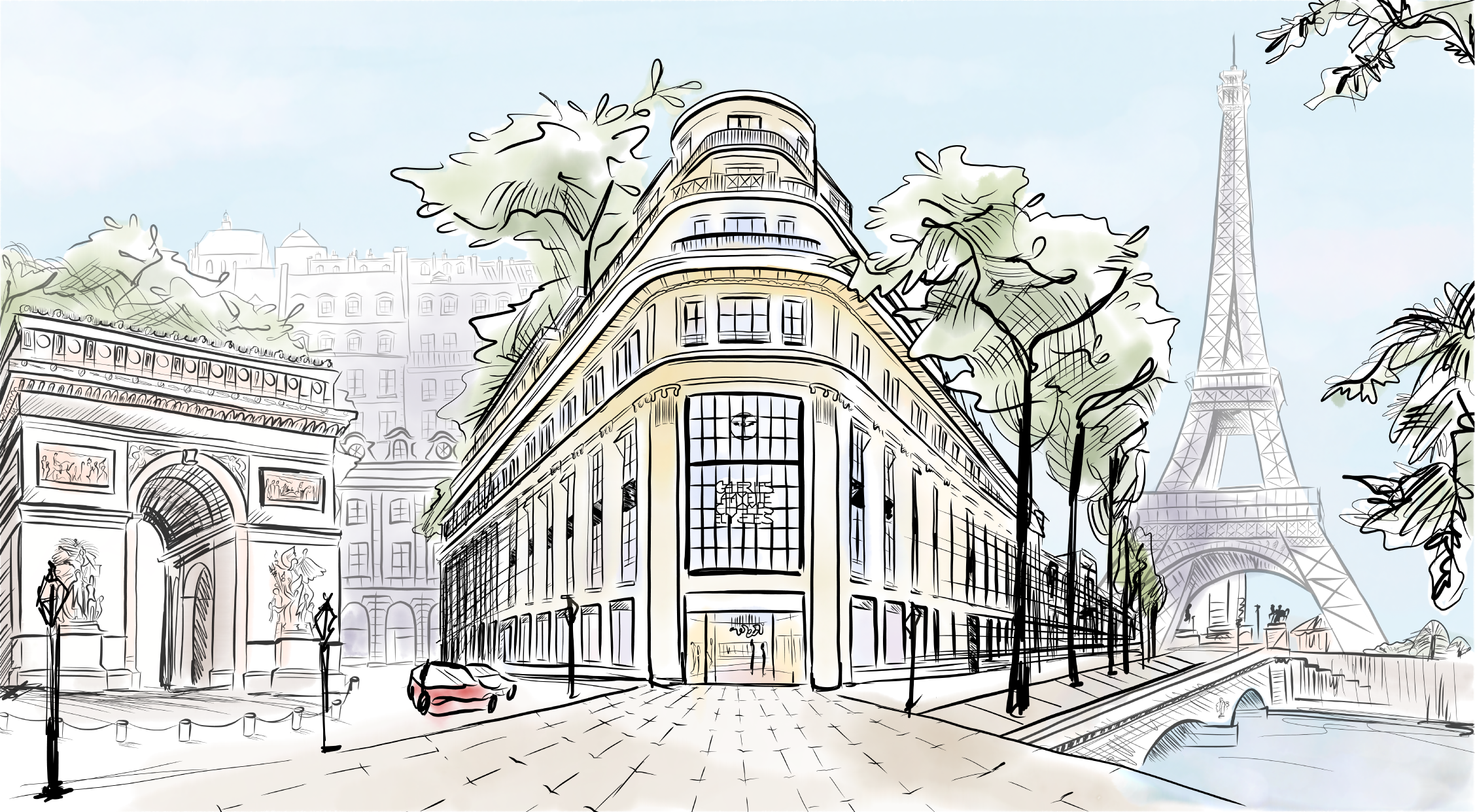 Inspired by the pastel hues of Clé de Peau’s product line, this series of dreamy, detailed sketches captures faraway destinations through a lens of quiet longing. Created during the height of COVID lockdowns, the artwork reflects the desire to travel—and shop—that many felt while grounded from their favourite global escapes.