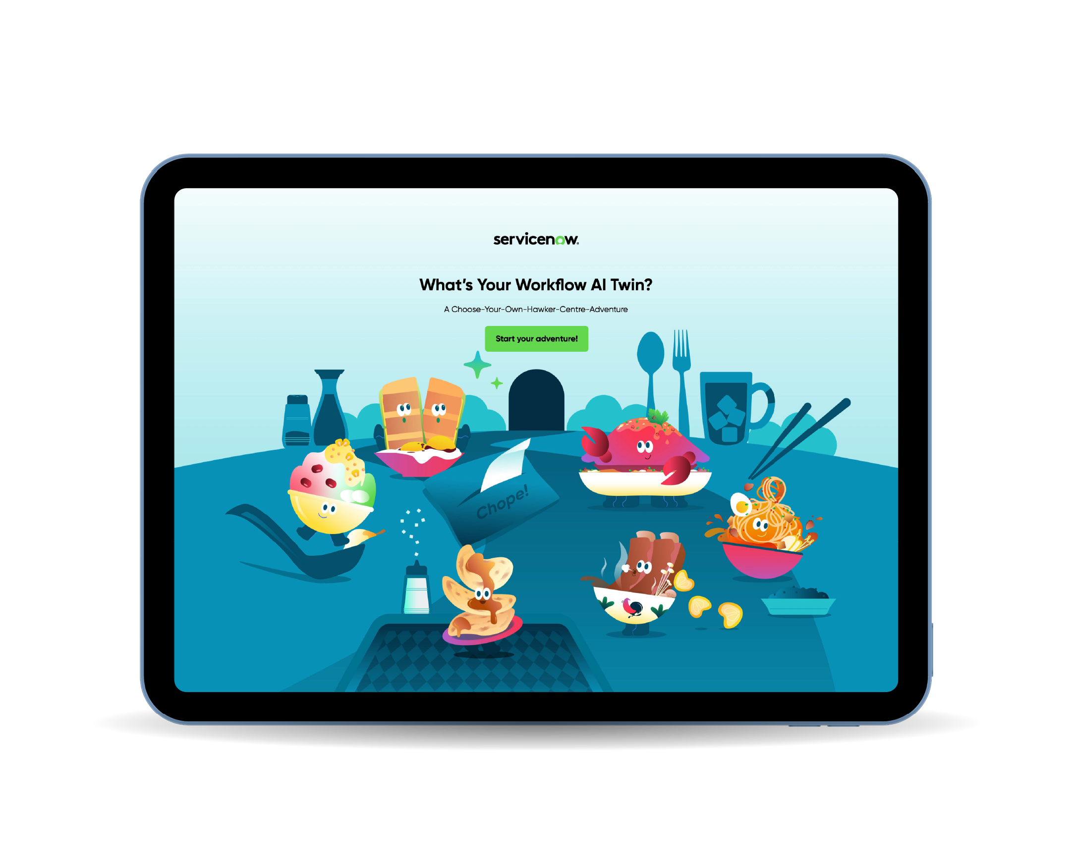 To spark engagement with the National Environment Agency (NEA), we created an interactive personality quiz that reveals which of six AI Agent personas best represents the user. Each persona was cleverly matched with a well-loved Singaporean dish, using food as a metaphor to illustrate the unique traits and strengths of each AI Agent within ServiceNow’s ecosystem.