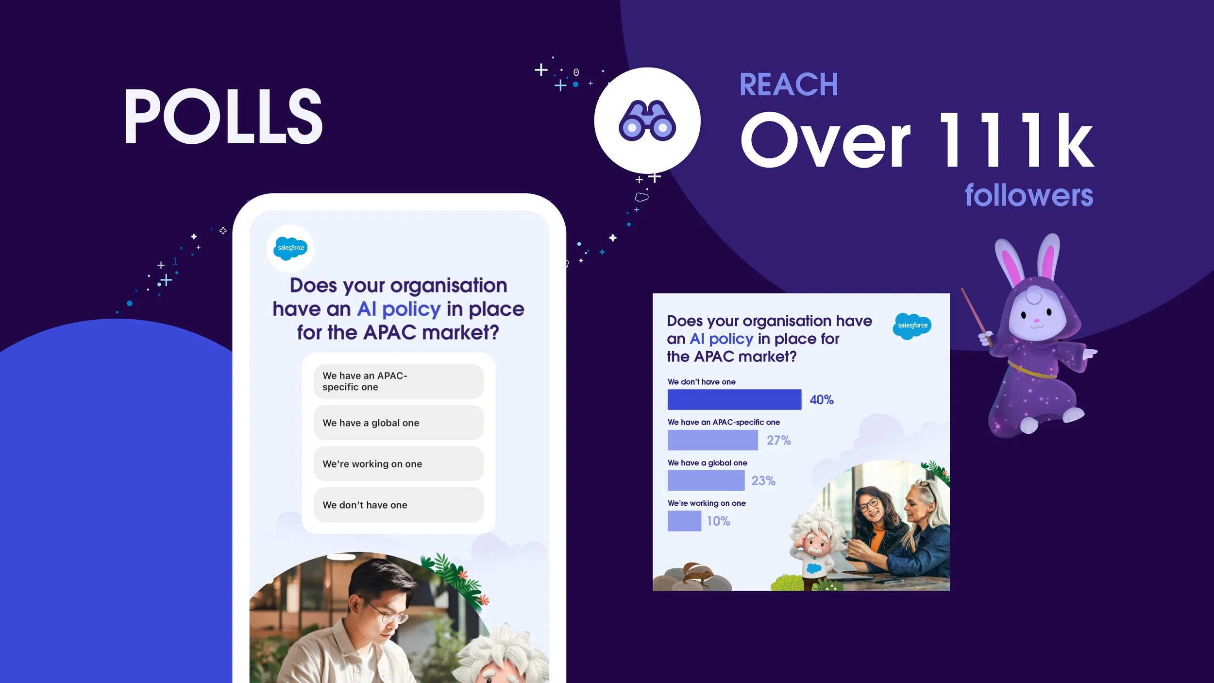 With 58 million LinkedIn pages and frequent Instagram posts, B2B content often blurs into sameness, worsened by stiff competition and unsupportive algorithms. Our goal was to help Salesforce stand out and win top-of-mind positioning by recruiting new APAC followers, increasing reach and impressions, and exceeding engagement benchmarks while boosting brand awareness and perception.